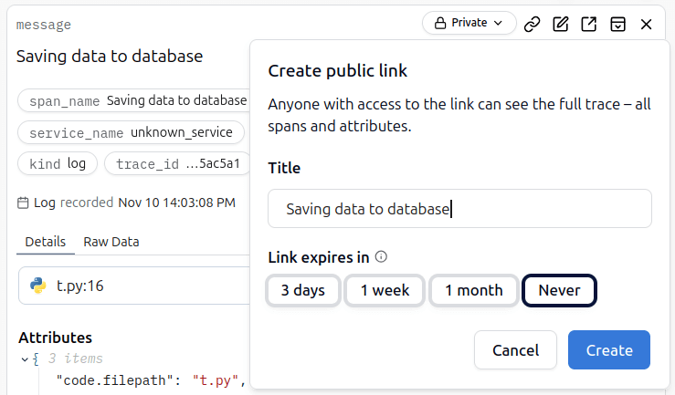 Public Traces lets you to create shareable links for specific traces. Perfect for collaborating with anyone who doesn't have Logfire access, or sharing debugging information.